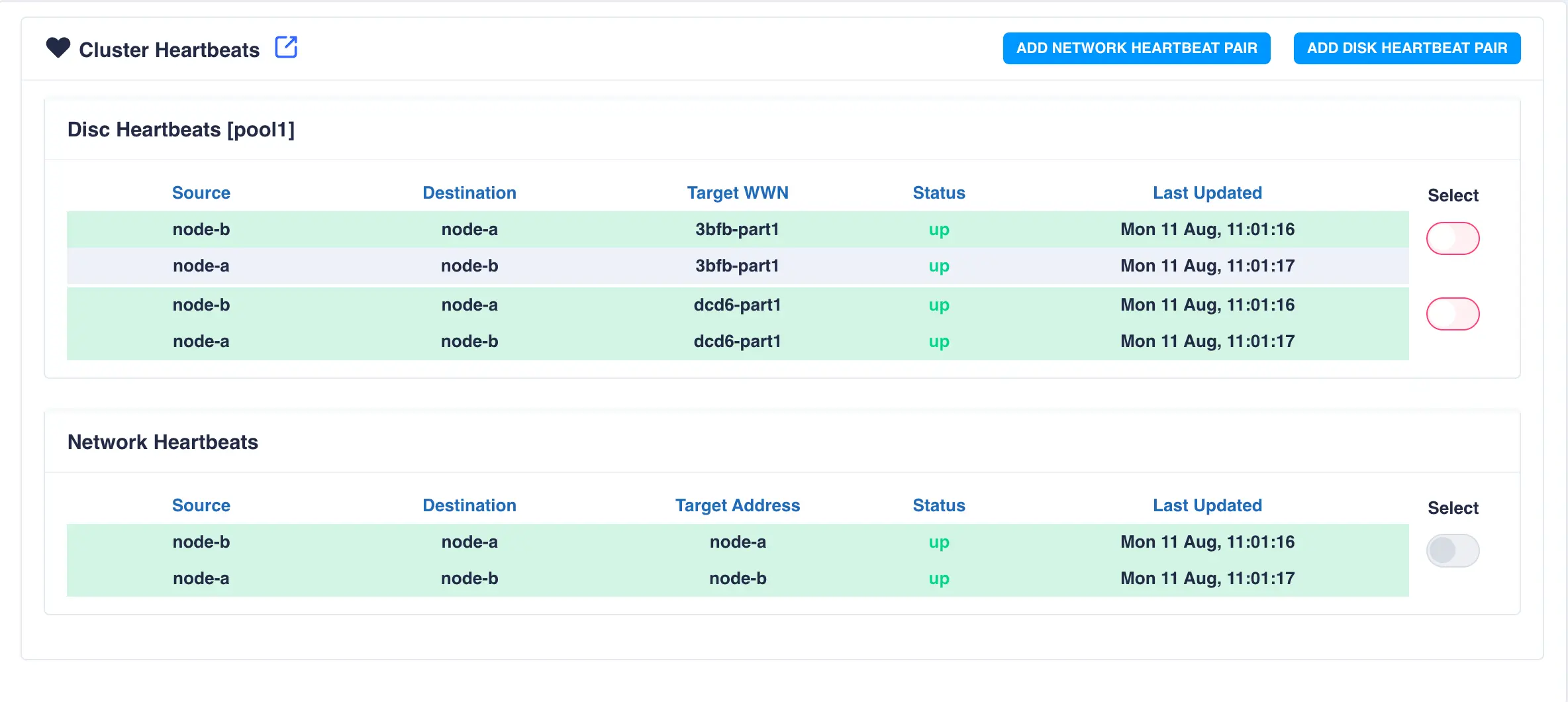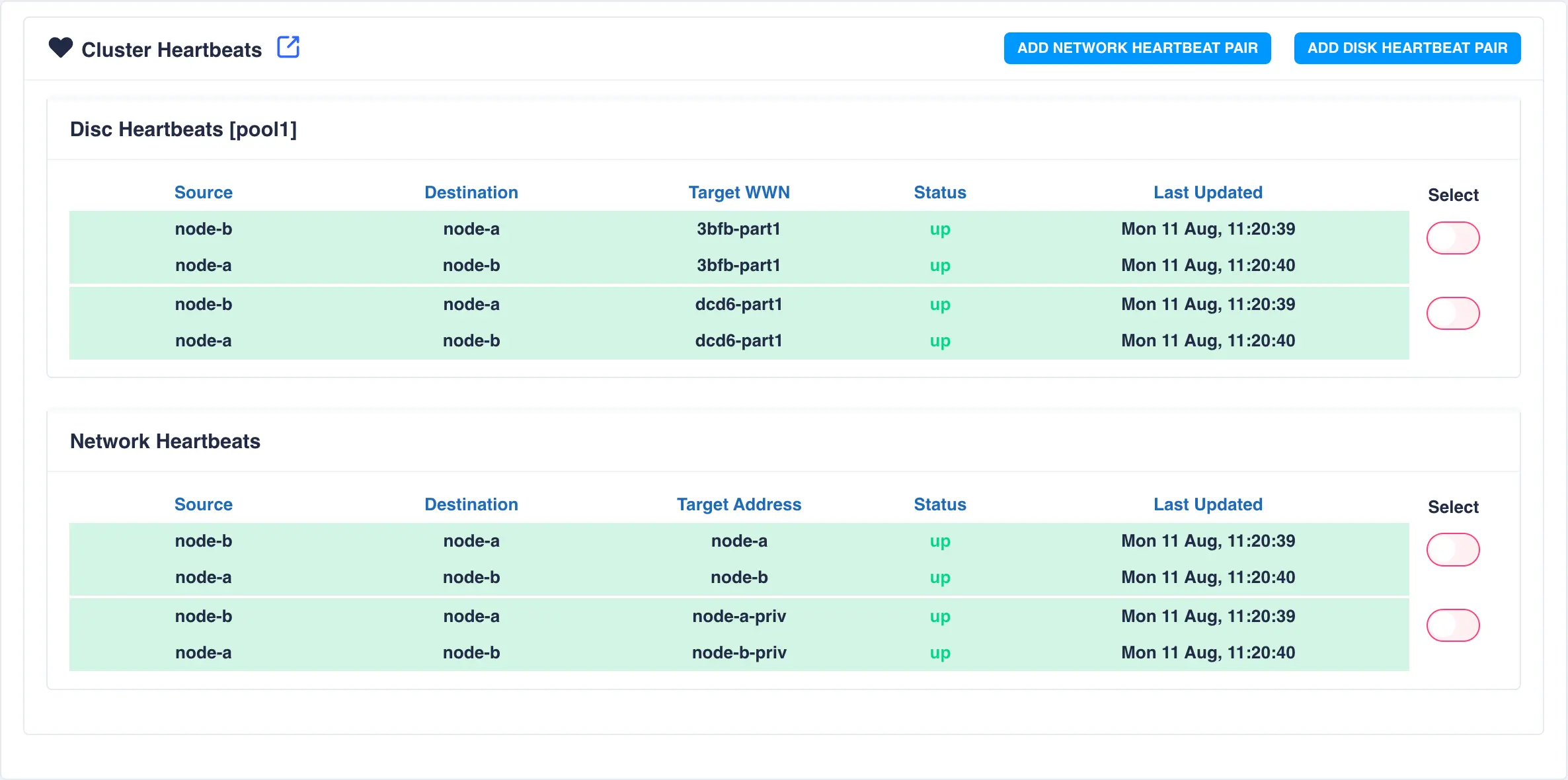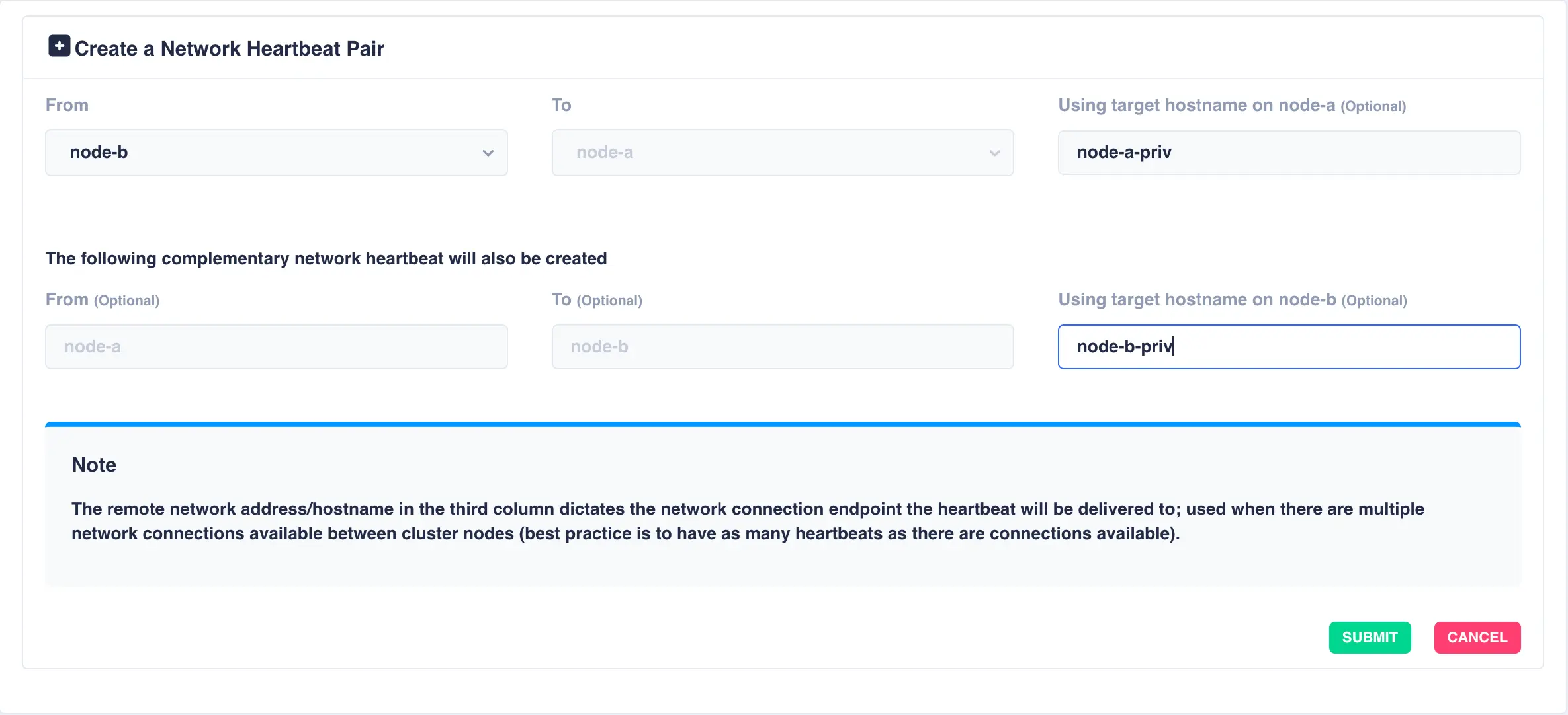 To add an additional network heartbeat to the cluster, select ADD NETWORK HEARTBEAT PAIR.