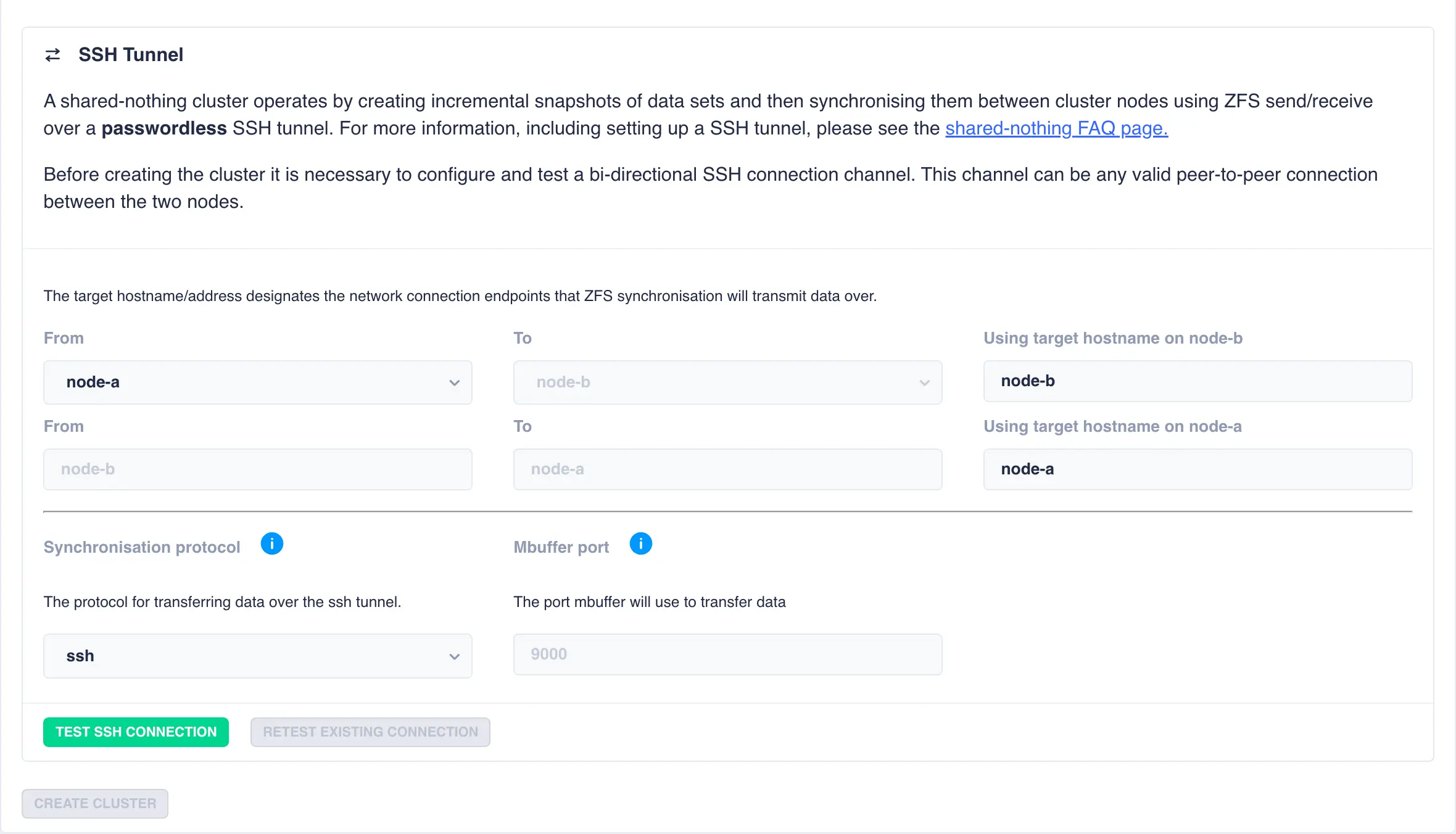 For shared nothing clusters an additional step is required to configure a bi-directional ssh tunnel between the two nodes. This tunnel is used to transfer snapshots between the two cluster nodes. A panel with pre-filled out values consisting of the cluster node names is presented: