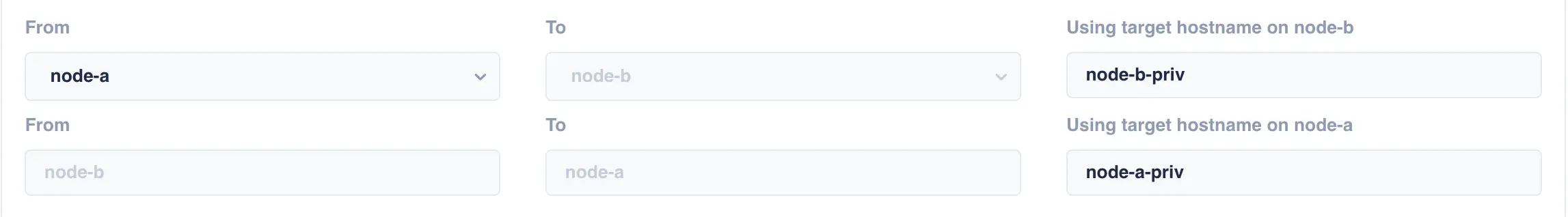 two nodes using the addresses node-a-priv and node-b-priv respectively then this would be