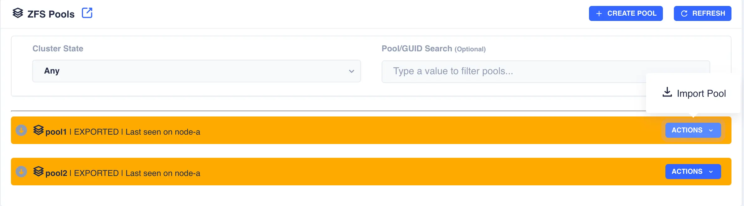 In the above example pool1 and pool2 are both exported. To import pool1, open the pools ACTIONS