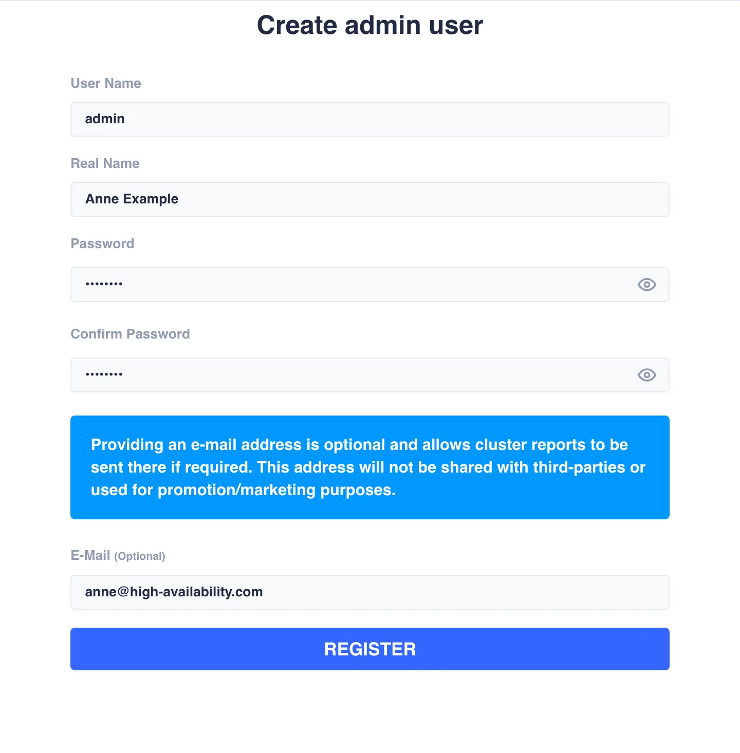 Once you click the REGISTER button, the admin user account will be