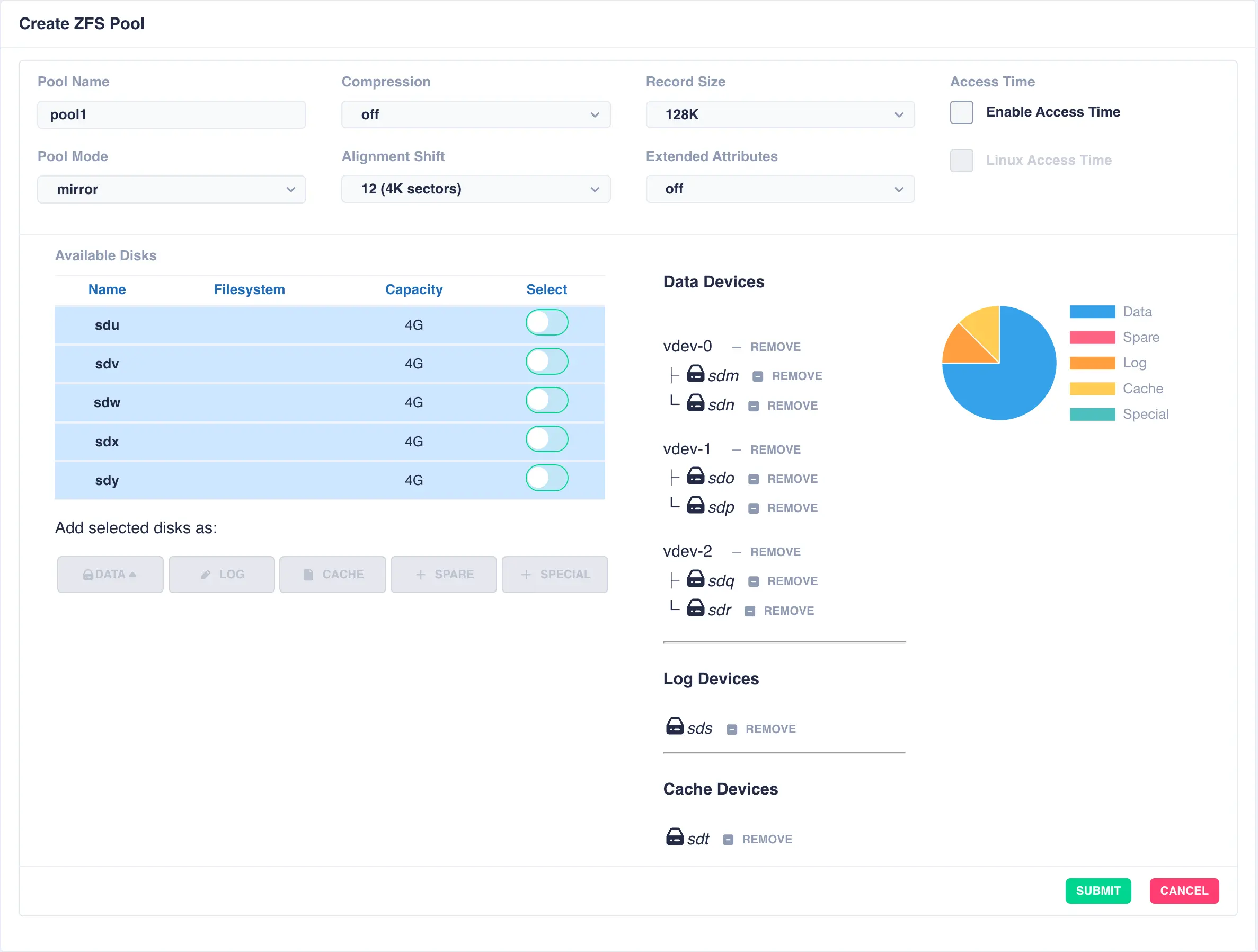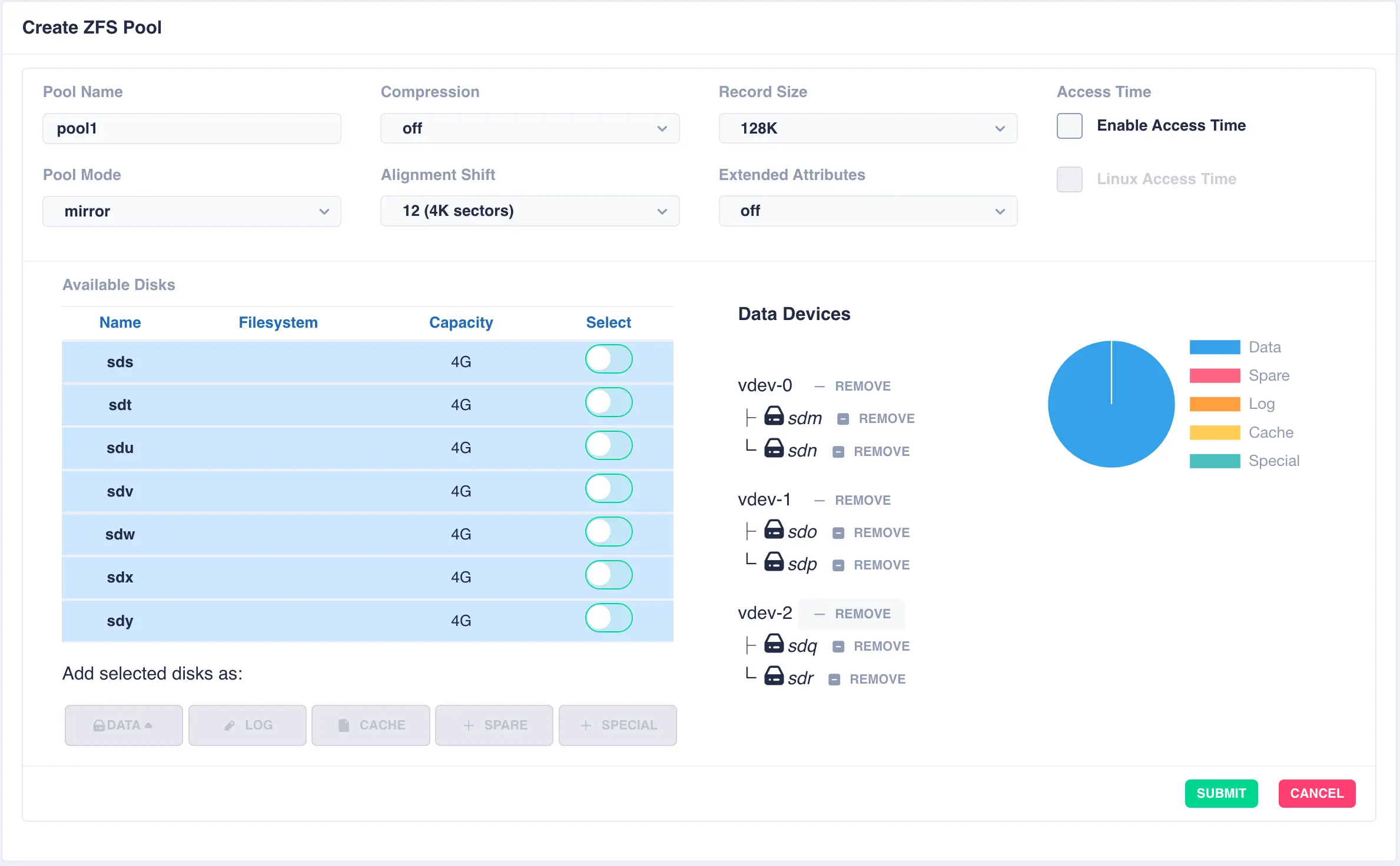 Available Disks list and click DATA to add them as data vdevs - in this example sdm and sdn